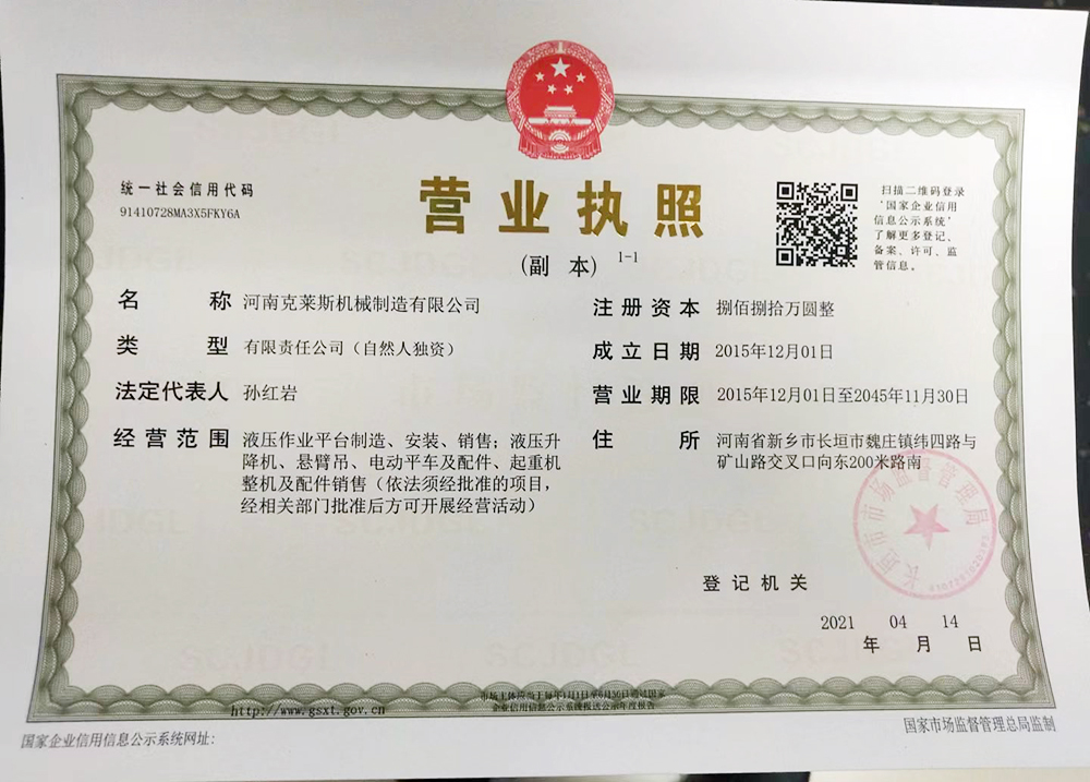 河南克萊斯機械制造有限公司位于河南省長垣市魏莊工業園區,公司注冊資金捌佰捌拾萬元整,在職員工40余名,擁有研發設計團隊,是一家生產液壓升降作業平臺及旋臂起重機生產銷售的廠家?! 」局饕a品有:固定導軌式液壓升降作業平臺、移動式液壓升降平臺、車載式液壓升降平臺;定柱式懸臂吊、墻壁吊、電動平車、登車橋等?! 【嫉脑O備,嚴格的管理是公司得以不斷發展壯大、產品能夠贏得用戶依賴的根本所在。  “精確、...... <了解更多>
